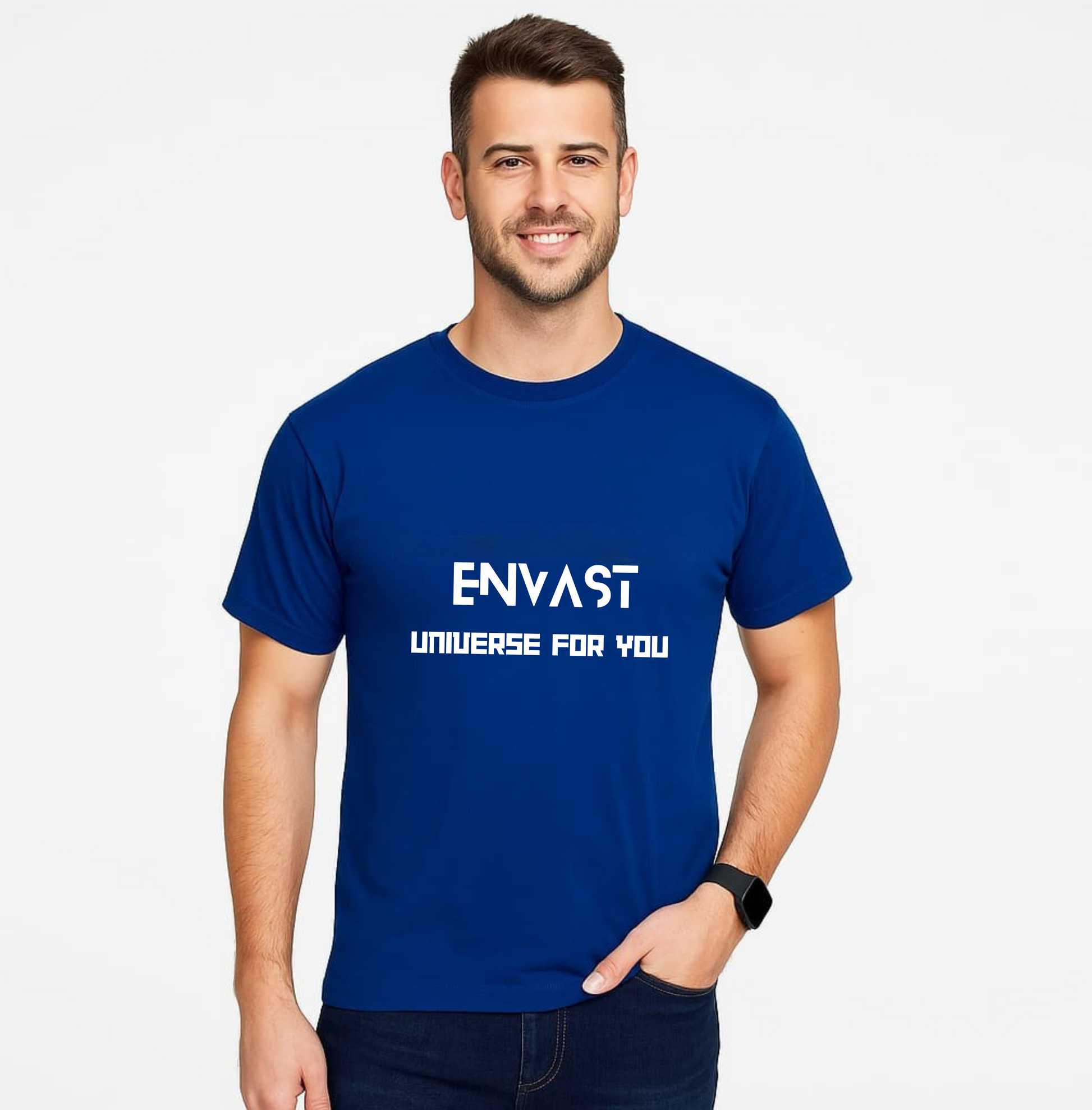 Design: Minimalist royal blue t-shirt with a striking white 'Envast-Universe for You' print